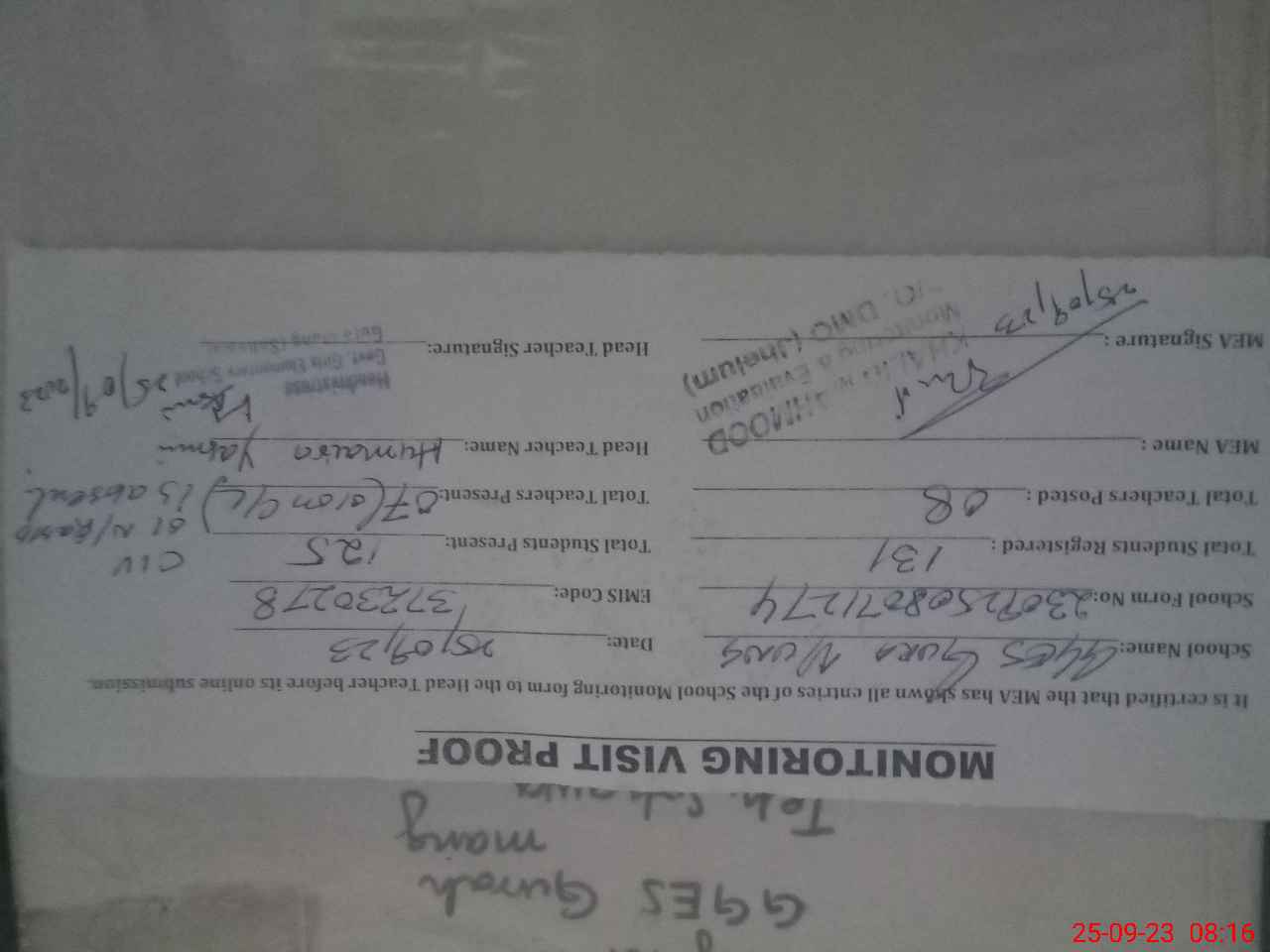 | Attendance Register | Head Teacher | MEA with School | Visit Proof |
