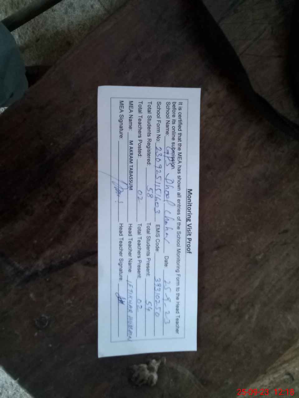 | Attendance Register | Head Teacher | MEA with School | Visit Proof |