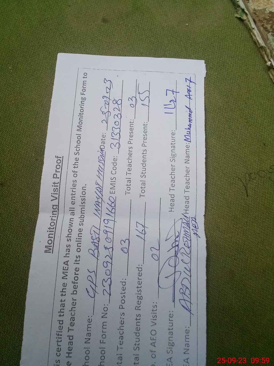 | Attendance Register | Head Teacher | MEA with School | Visit Proof |