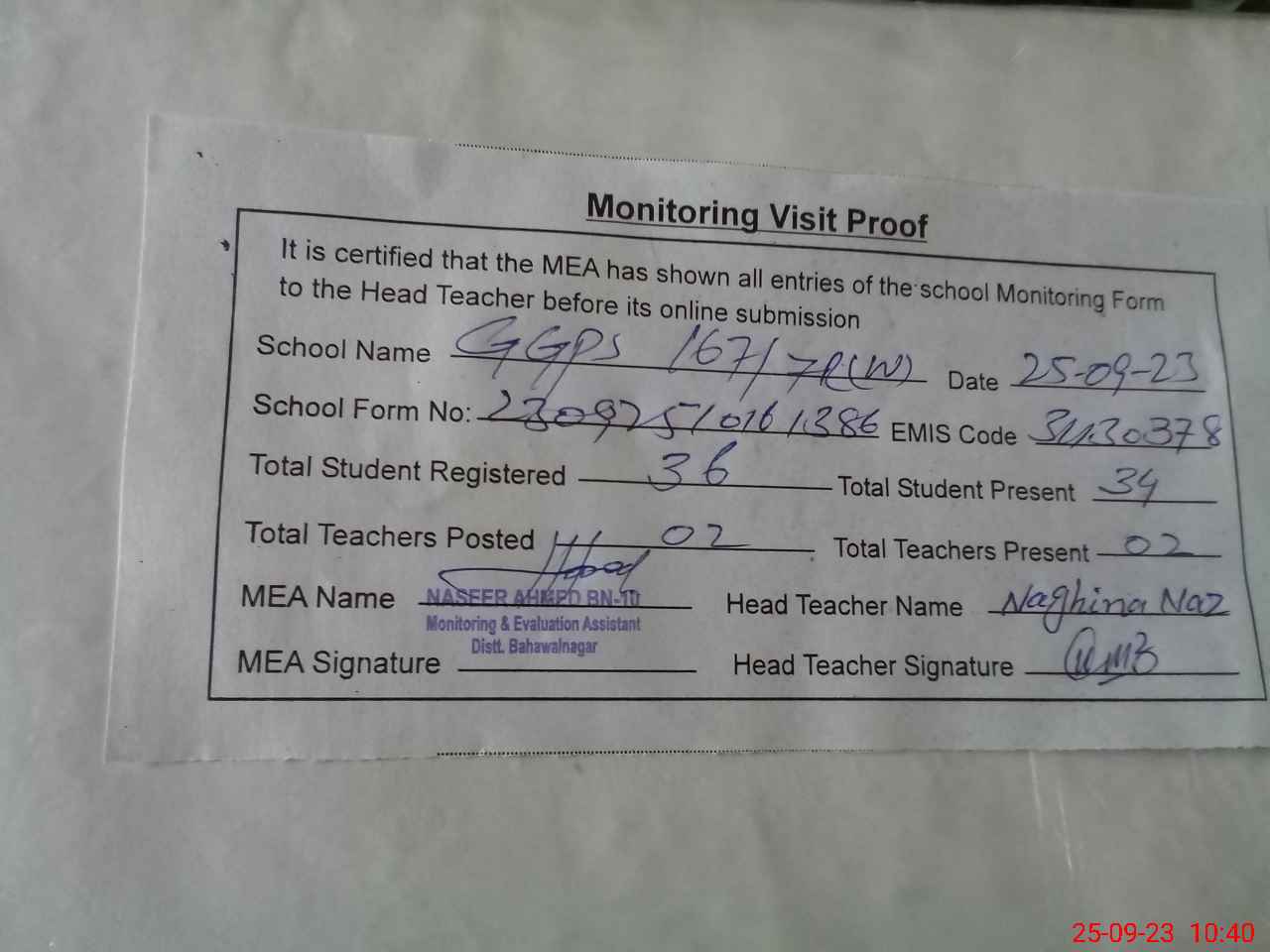 | Attendance Register | Head Teacher | MEA with School | Visit Proof |