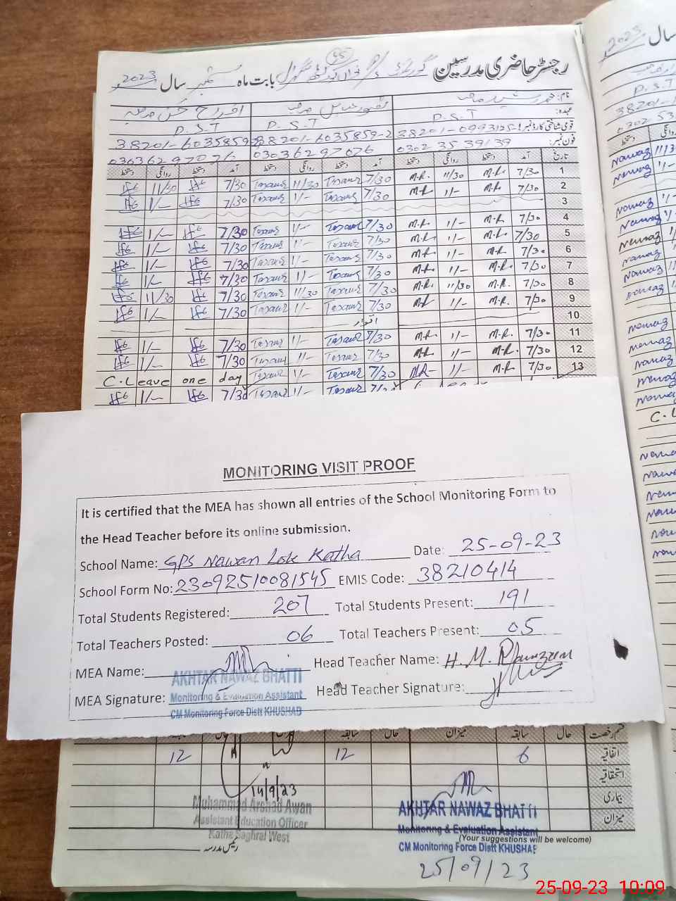 | Attendance Register | Head Teacher | MEA with School | Visit Proof |