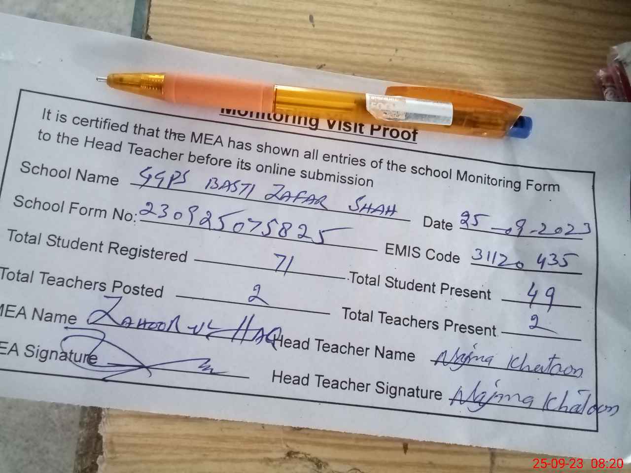 | Attendance Register | Head Teacher | MEA with School | Visit Proof |