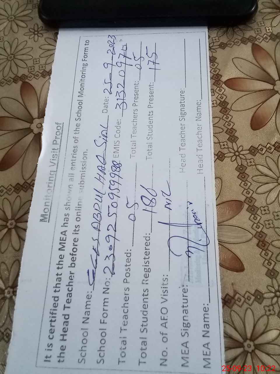 | Attendance Register | Head Teacher | MEA with School | Visit Proof |