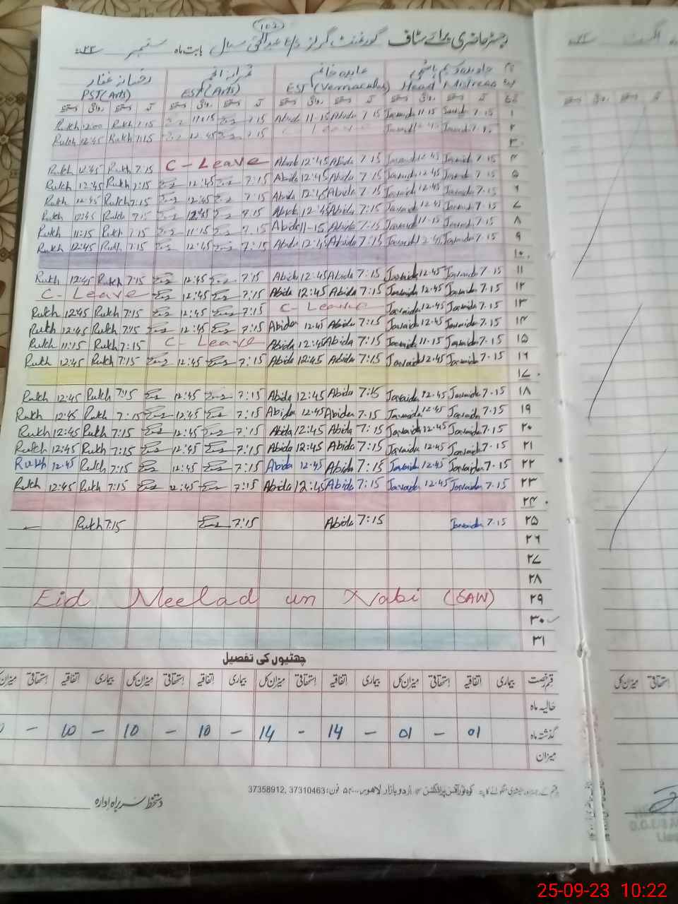 | CNIC | Full Name | Designation | R/C | Absence During Last Calender Month |