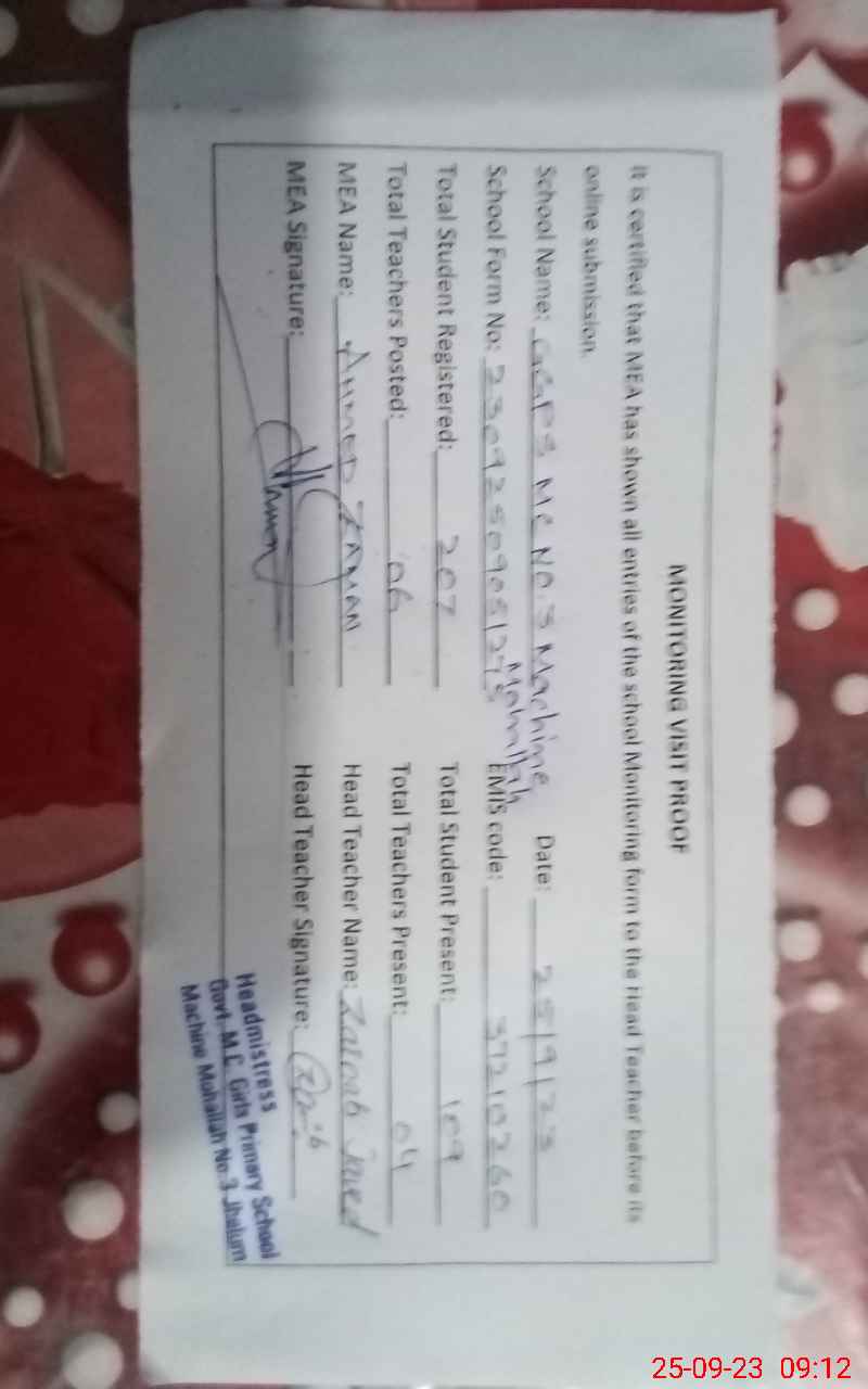 | Attendance Register | Head Teacher | MEA with School | Visit Proof |