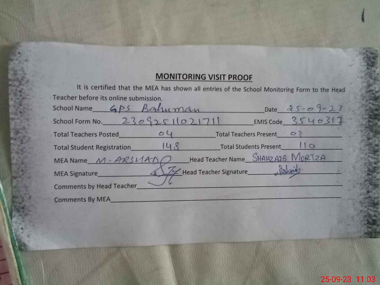 | EMIS Code: 35430317 | Name of School: GPS BAHUMAN | |||