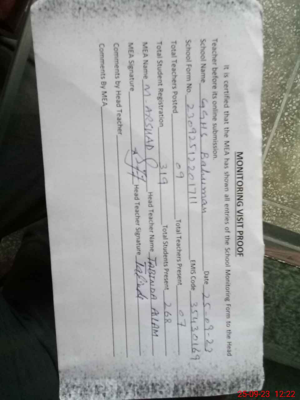 | Attendance Register | Head Teacher | MEA with School | Visit Proof |