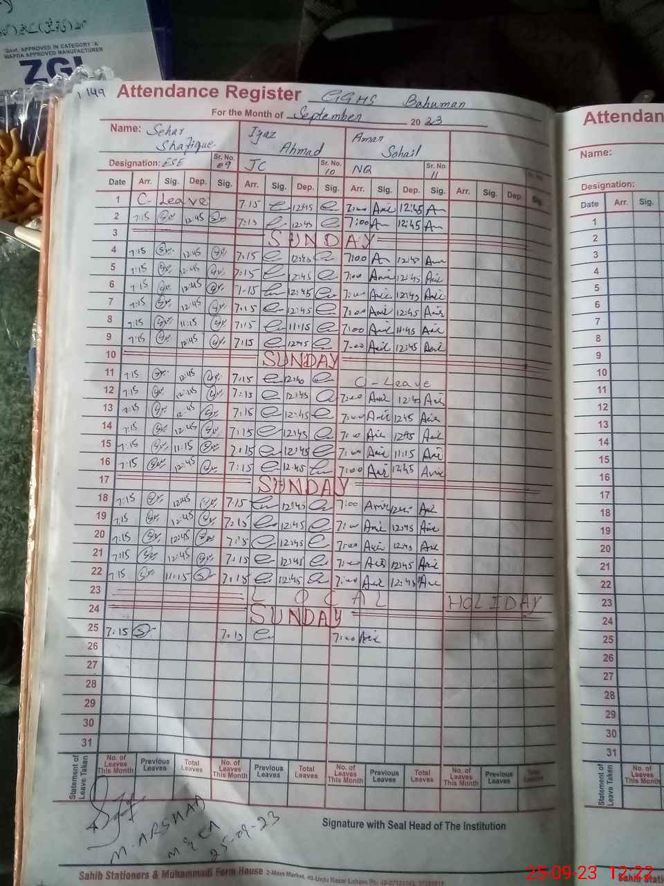 | 35**** | Sa**** Ha**** | 5 | 1 | 0 | 0 | 0 | 0 | 0 | 0 | 0 | 0 | 0 | Absent (Un-Authorized) |