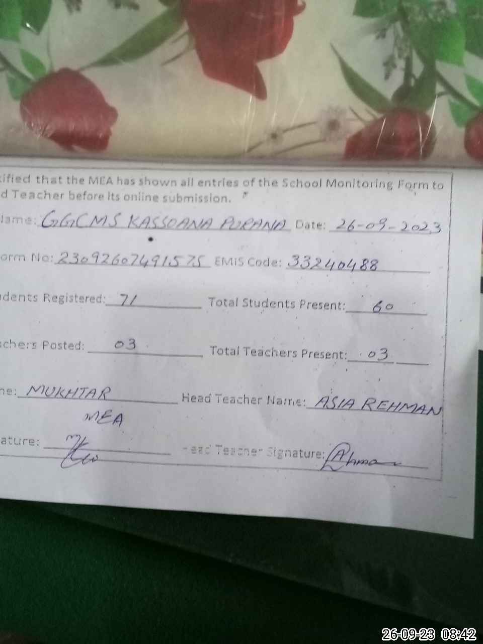 | Name: AS**** RE**** Designation: (School Headmaster's/Headmistress's) SST Phone/Cell Number: 03**** |