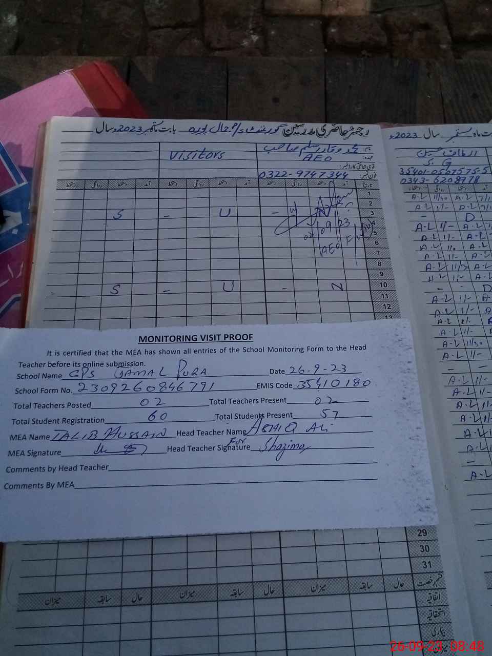 | Attendance Register | Head Teacher | MEA with School | Visit Proof |