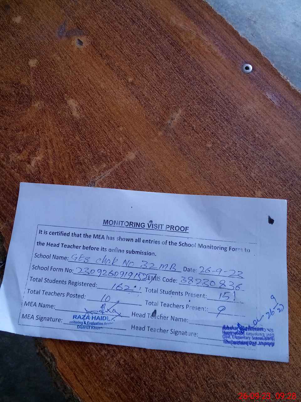 | Attendance Register | Head Teacher | MEA with School | Visit Proof |