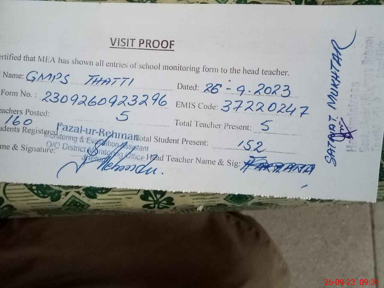 | Attendance Register | Head Teacher | MEA with School | Visit Proof |