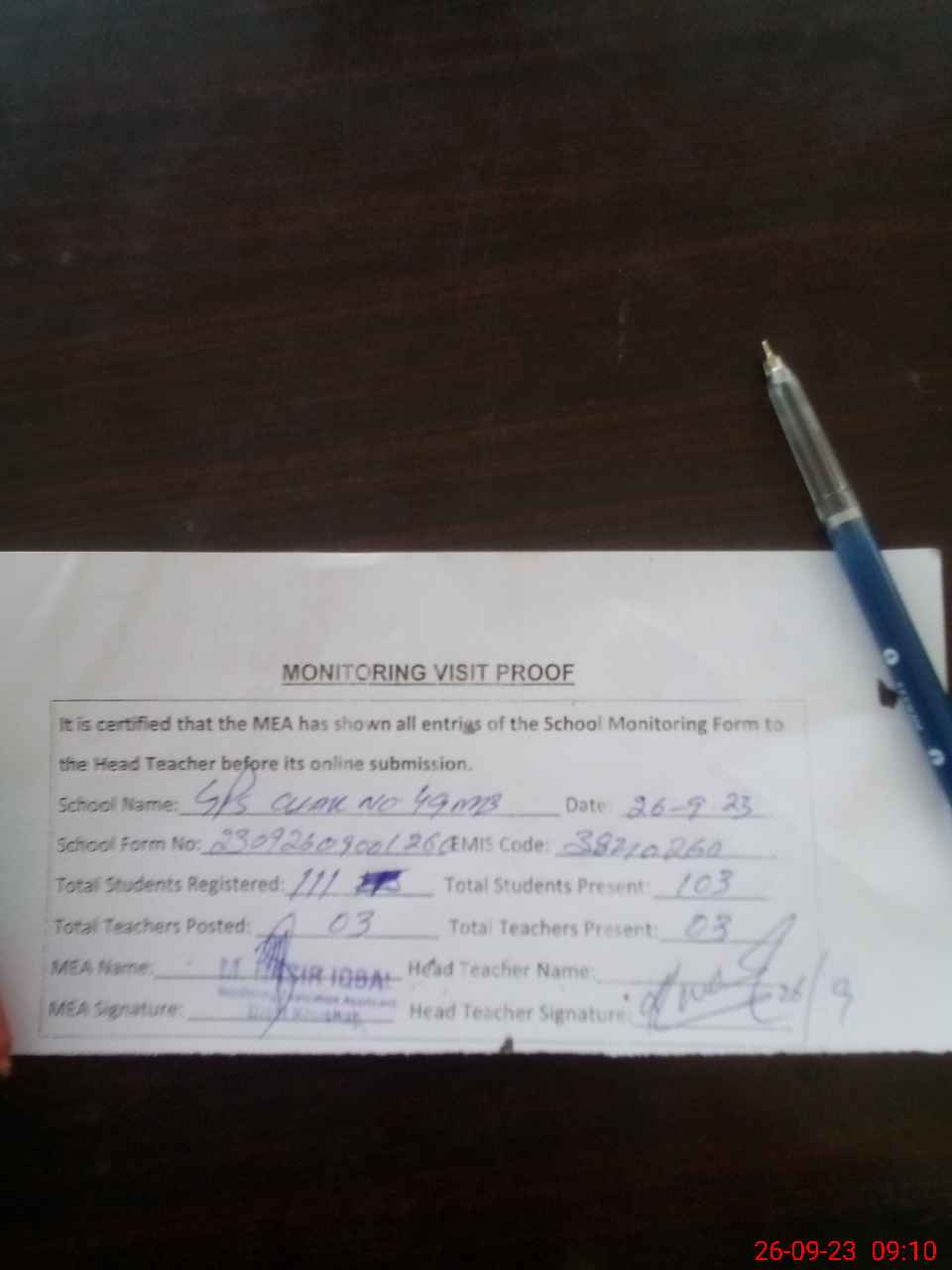 | Attendance Register | Head Teacher | MEA with School | Visit Proof |