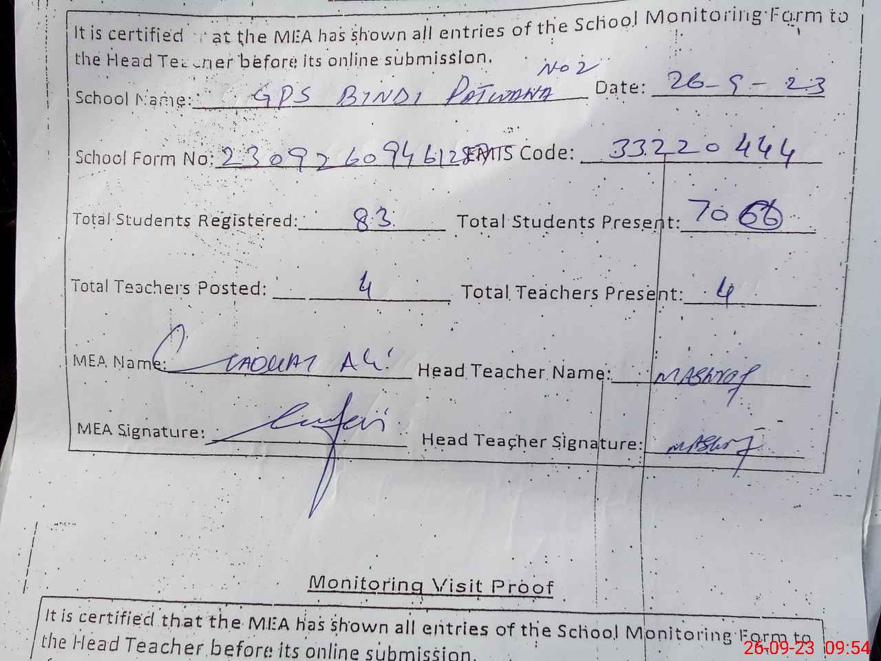 | Attendance Register | Head Teacher | MEA with School | Visit Proof |