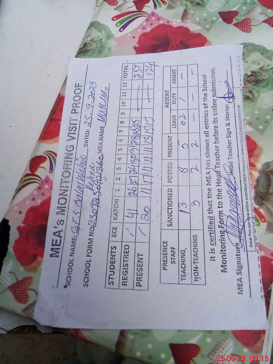 | Attendance Register | Head Teacher | MEA with School | Visit Proof |