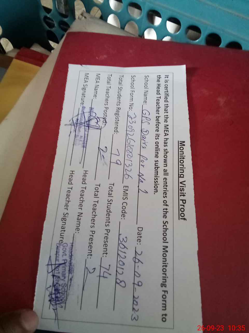 | Attendance Register | Head Teacher | MEA with School | Visit Proof |