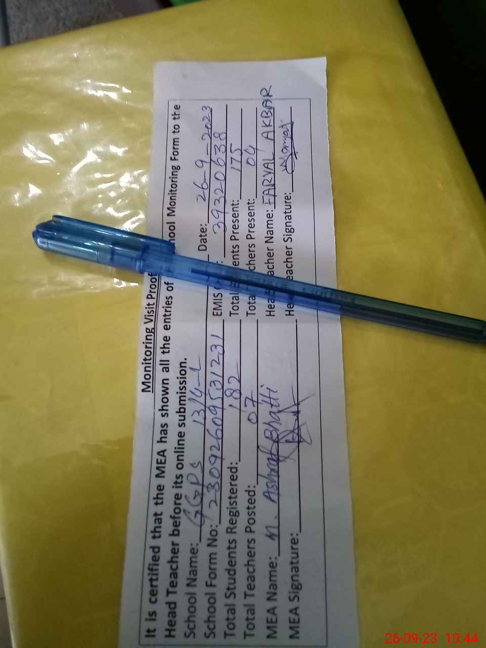 | Attendance Register | Head Teacher | MEA with School | Visit Proof |