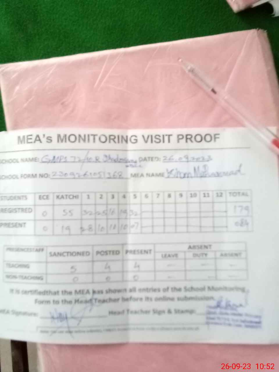 | Attendance Register | Head Teacher | MEA with School | Visit Proof |