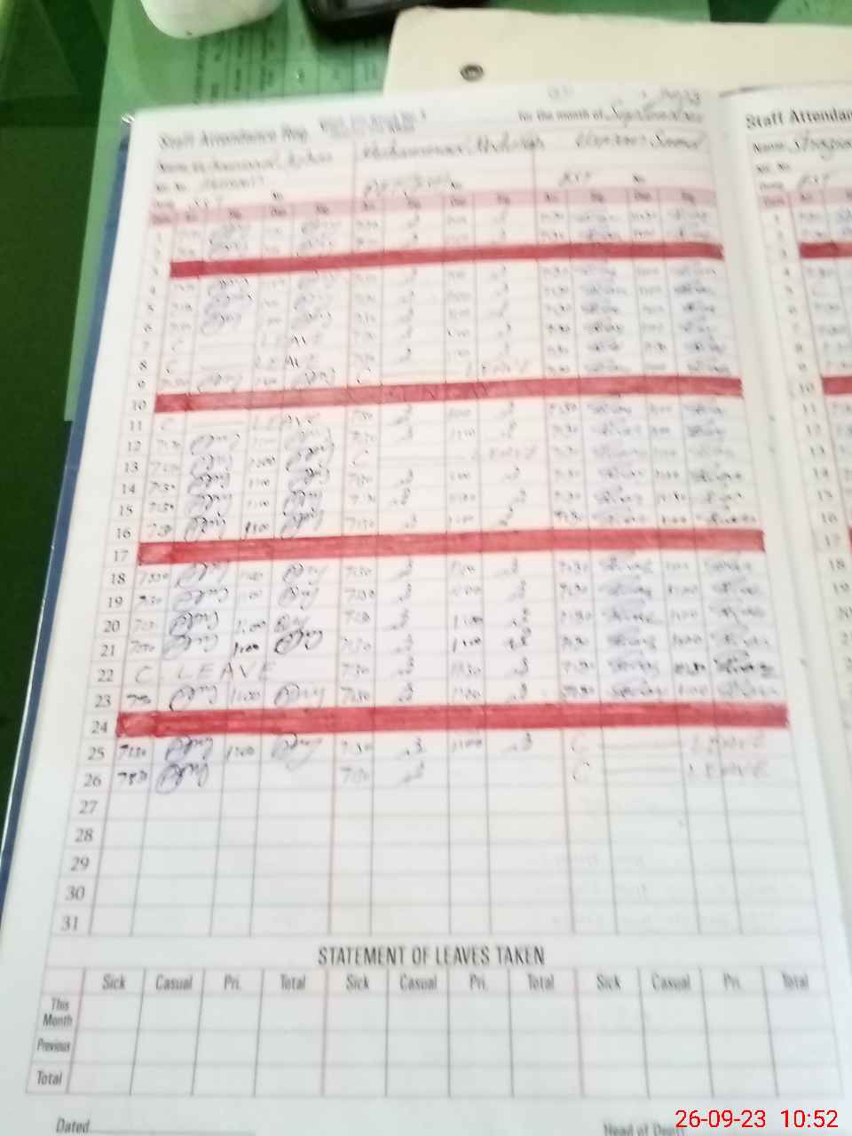 | Monitoring Date: 26-09-2023 | Start Time: 26-09-2023 10:33 AM | End Time: 26-09-2023 10:57 AM | Name of MEA: Sa**** Hu**** | |