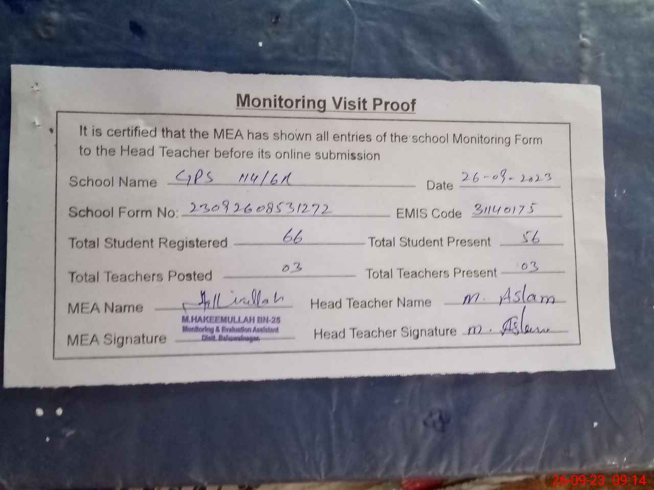| EMIS Code: 31140175 | Name of School: GPS CHAK NO 114/6-R | |||