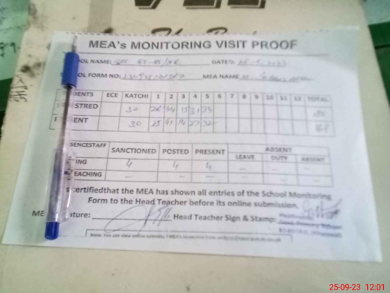 | Attendance Register | Head Teacher | MEA with School | Visit Proof |