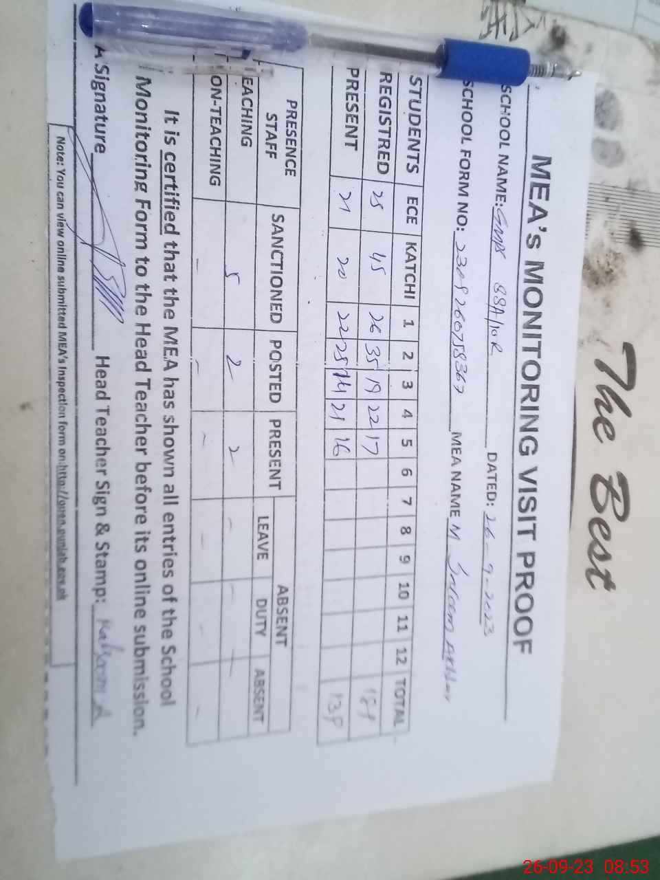 | Attendance Register | Head Teacher | MEA with School | Visit Proof |