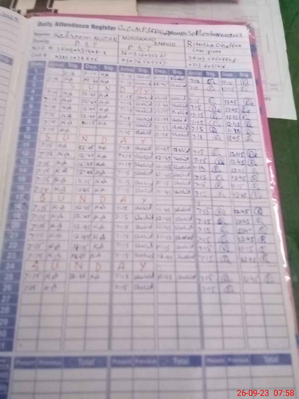 | CNIC | Full Name | Designation | R/C | Absence during last cal. month |