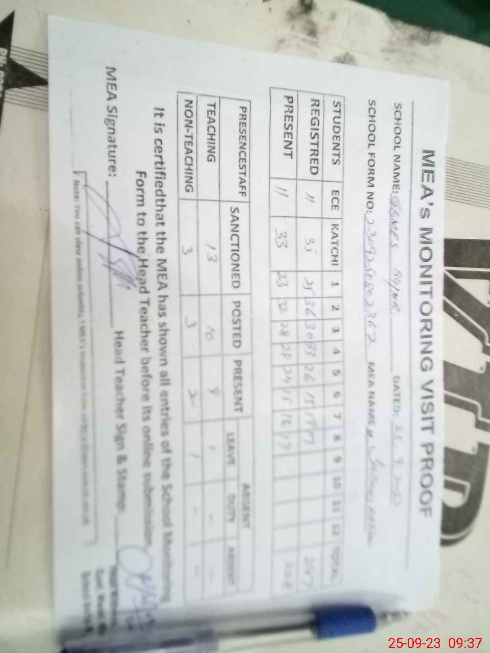 | Attendance Register | Head Teacher | MEA with School | Visit Proof |