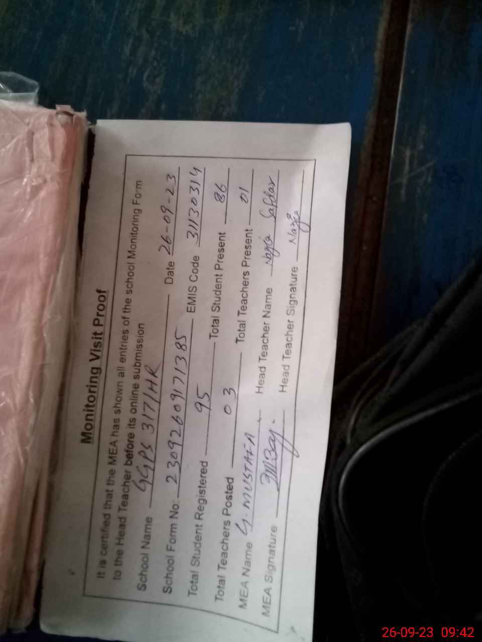 | Attendance Register | Head Teacher | MEA with School | Visit Proof |