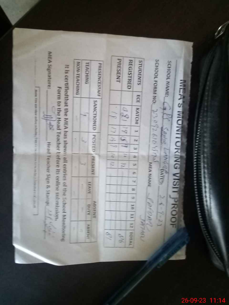 | Attendance Register | Head Teacher | MEA with School | Visit Proof |