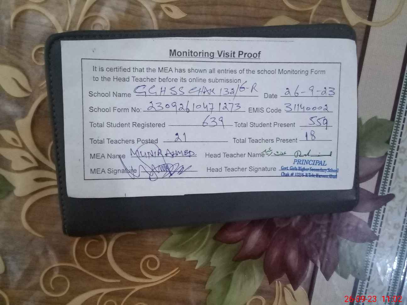| Attendance Register | Head Teacher | MEA with School | Visit Proof |