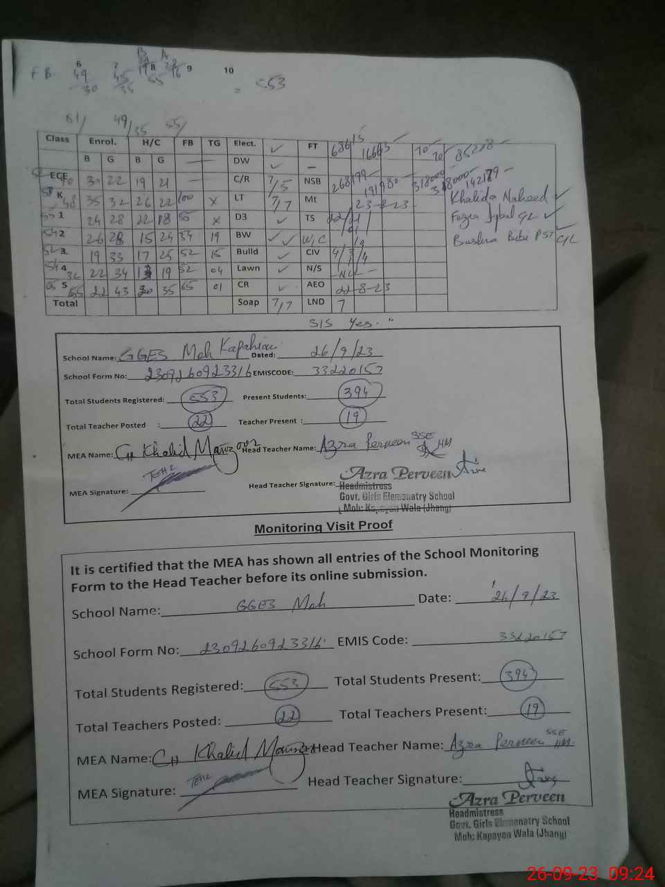 | Attendance Register | Head Teacher | MEA with School | Visit Proof |
