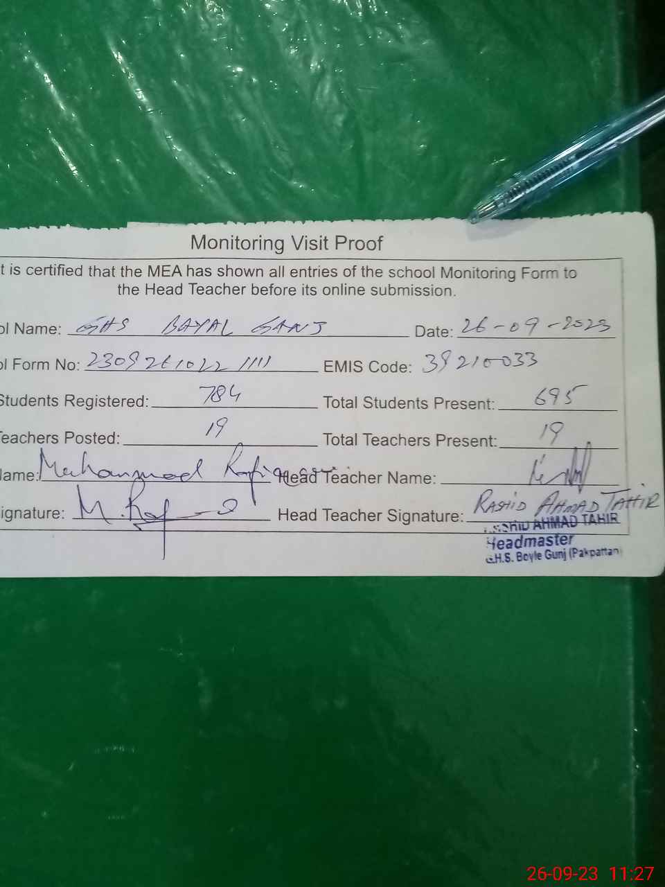 | Attendance Register | Head Teacher | MEA with School | Visit Proof |