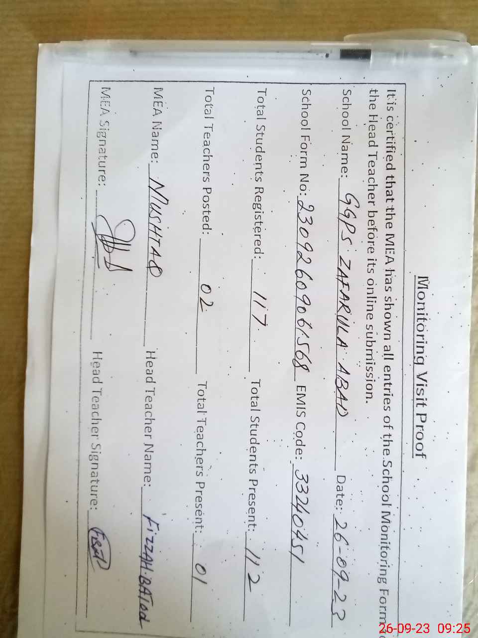| Attendance Register | Head Teacher | MEA with School | Visit Proof |