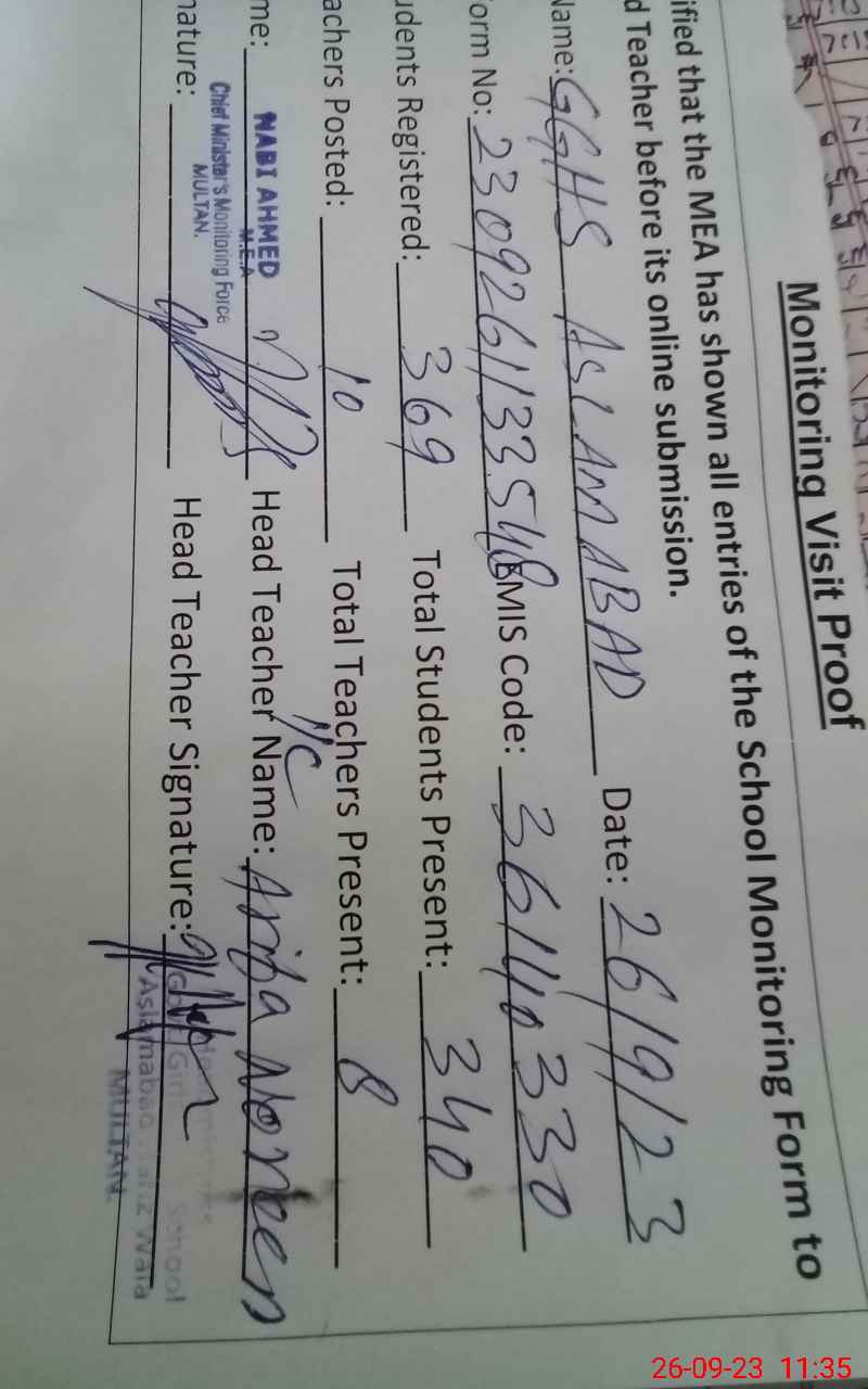 | EMIS Code: 36140330 | Name of School: GGHS ASLAM ABAD (HAFIZ WALA) | |||