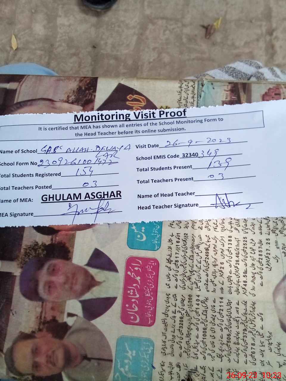 | Attendance Register | Head Teacher | MEA with School | Visit Proof |