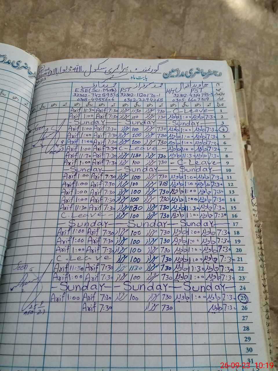 | Name: MU**** Sa**** Designation: (School Headmaster's/Headmistress's) ESE Phone/Cell Number: 03**** |