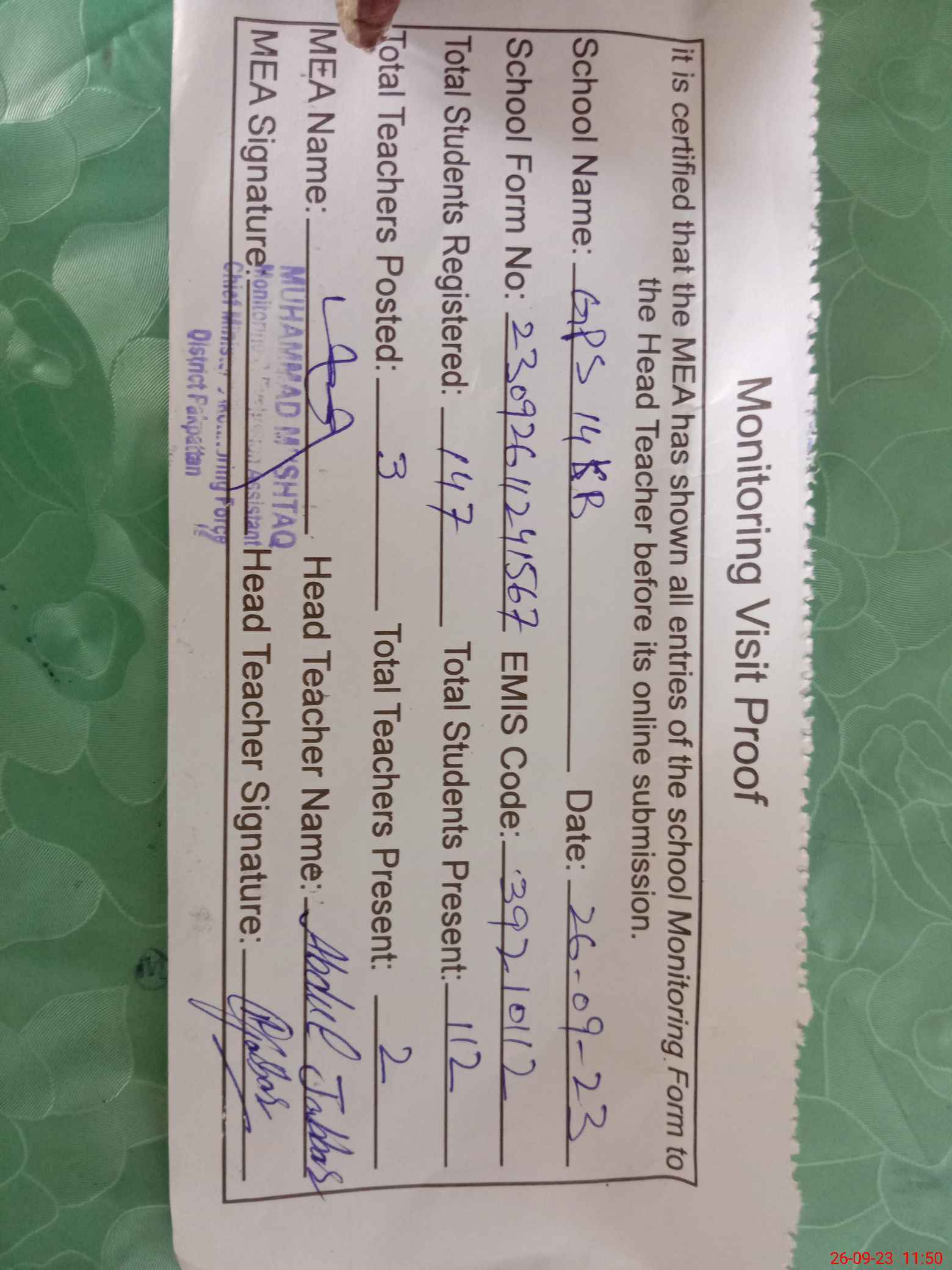| Attendance Register | Head Teacher | MEA with School | Visit Proof |