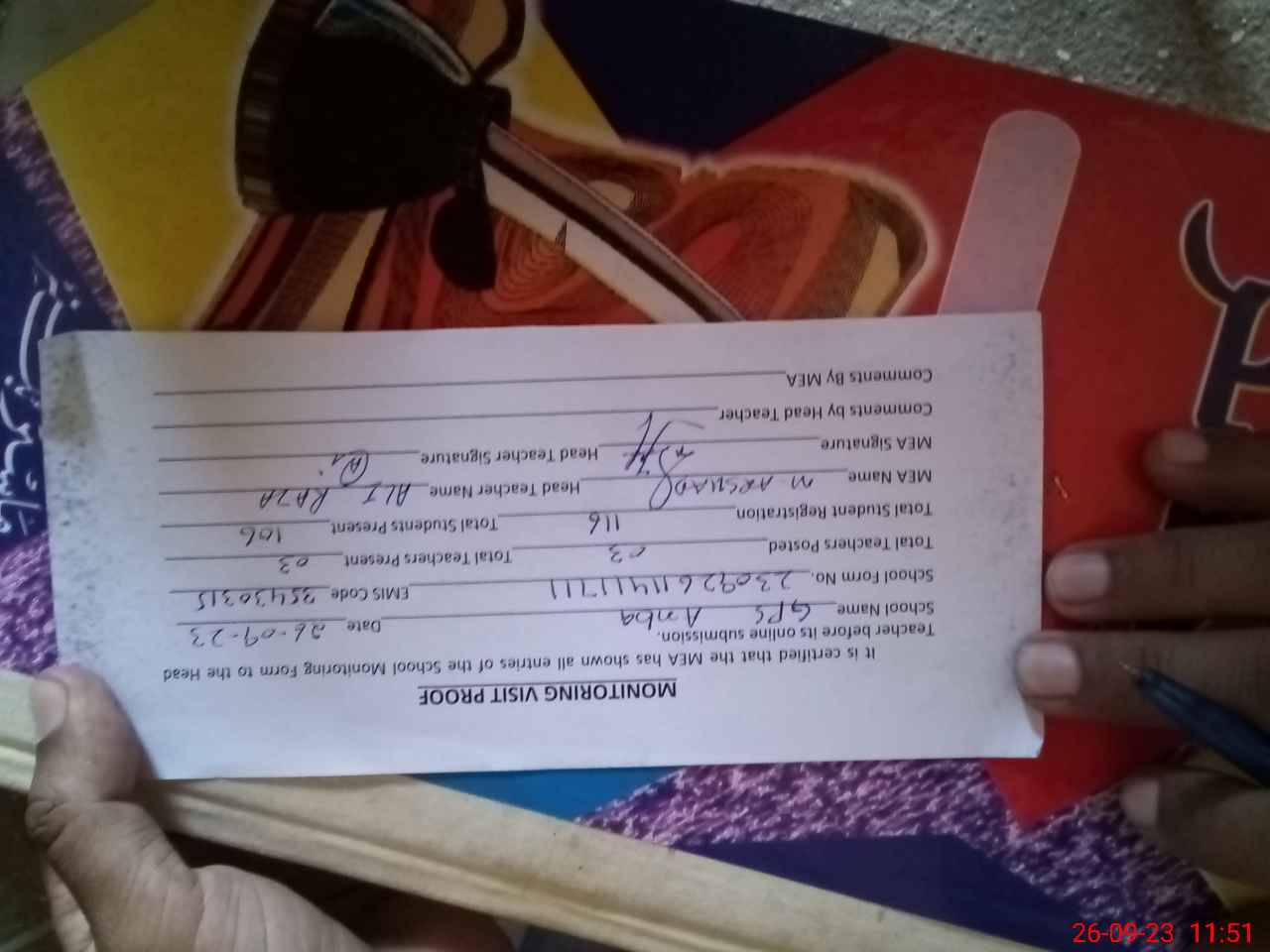 | Attendance Register | Head Teacher | MEA with School | Visit Proof |