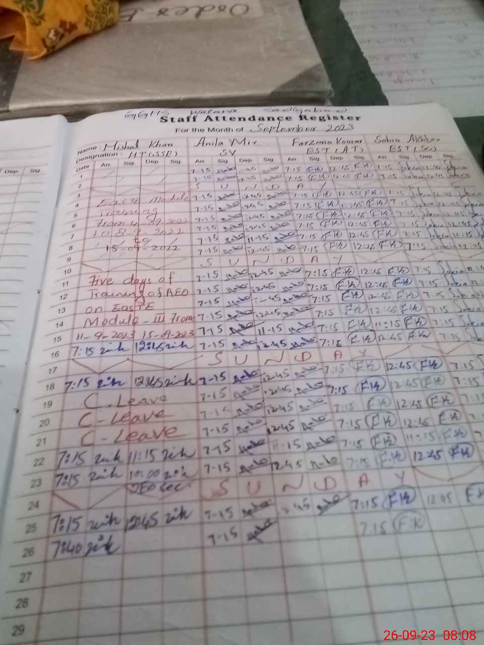 | Monitoring Date: 26-09-2023 | Start Time: 26-09-2023 08:02 AM | End Time: 26-09-2023 08:47 AM | Name of MEA: Mu**** Ak**** Ba**** | |