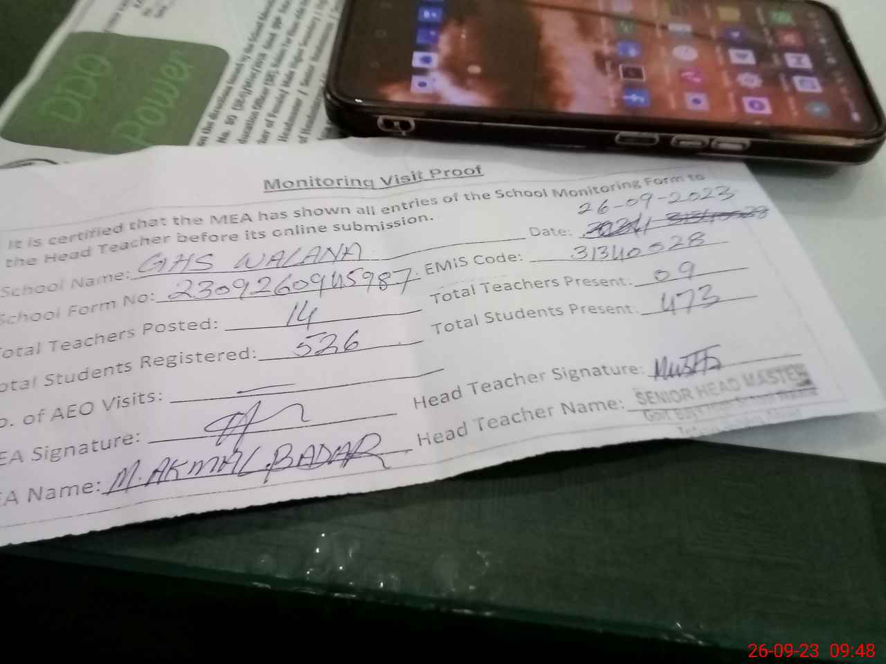 | Monitoring Date: 26-09-2023 | Start Time: 26-09-2023 09:18 AM | End Time: 26-09-2023 09:49 AM | Name of MEA: Mu**** Ak**** Ba**** | |