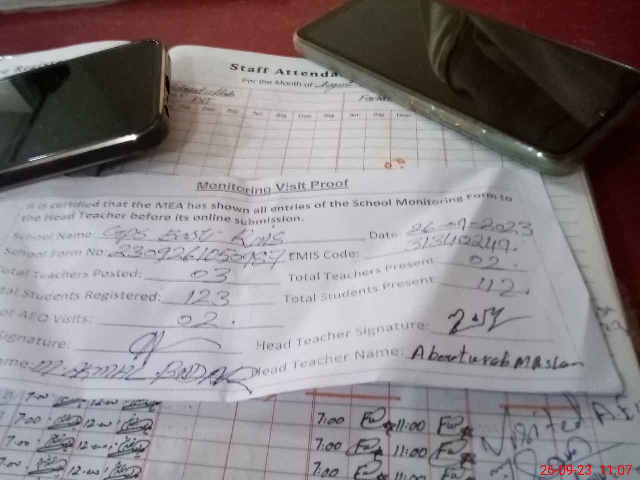 | Attendance Register | Head Teacher | MEA with School | Visit Proof |