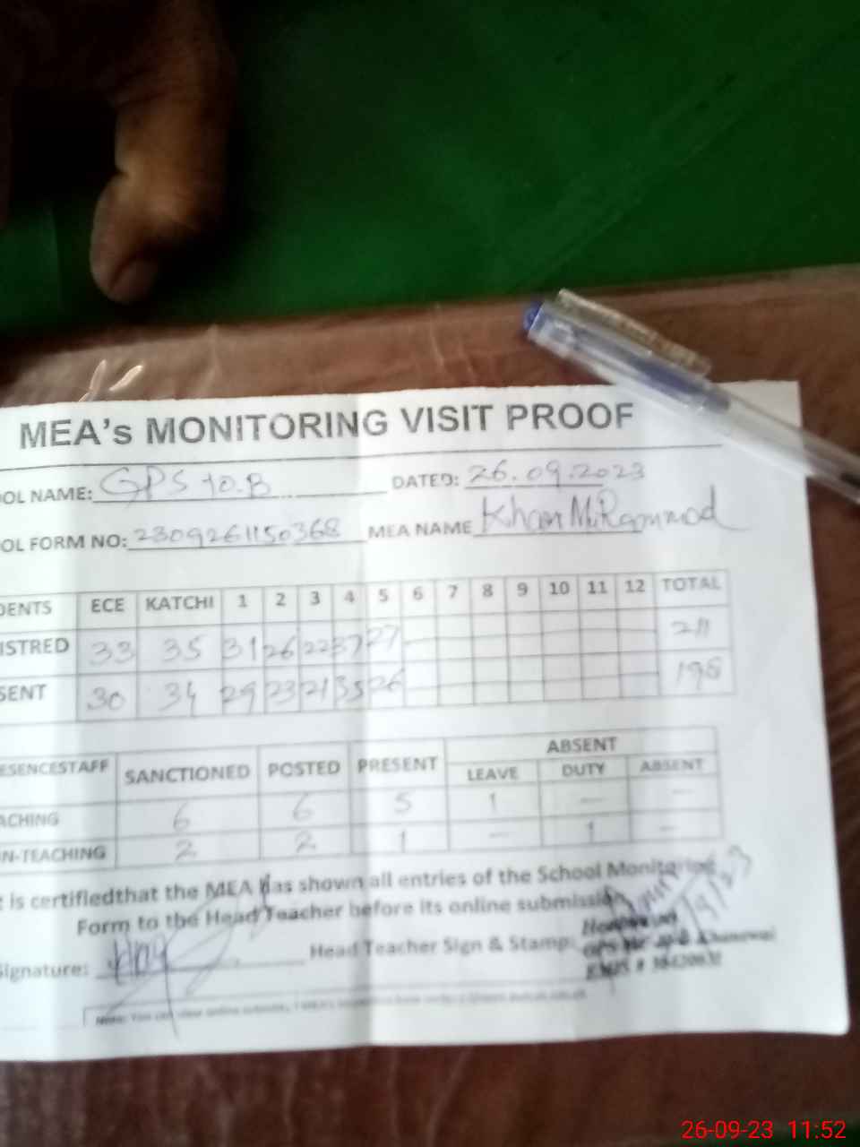 | Attendance Register | Head Teacher | MEA with School | Visit Proof |
