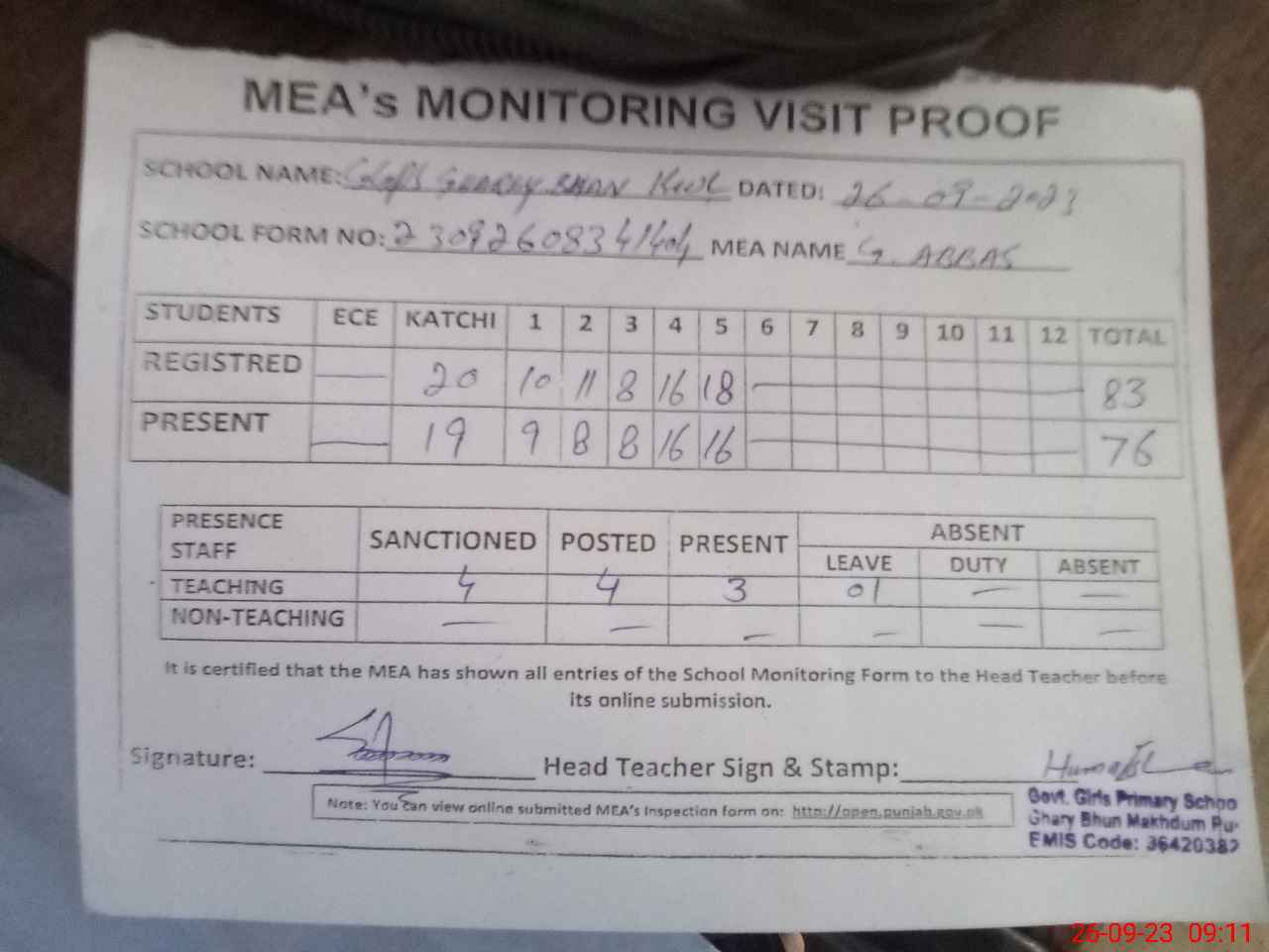 | Attendance Register | Head Teacher | MEA with School | Visit Proof |