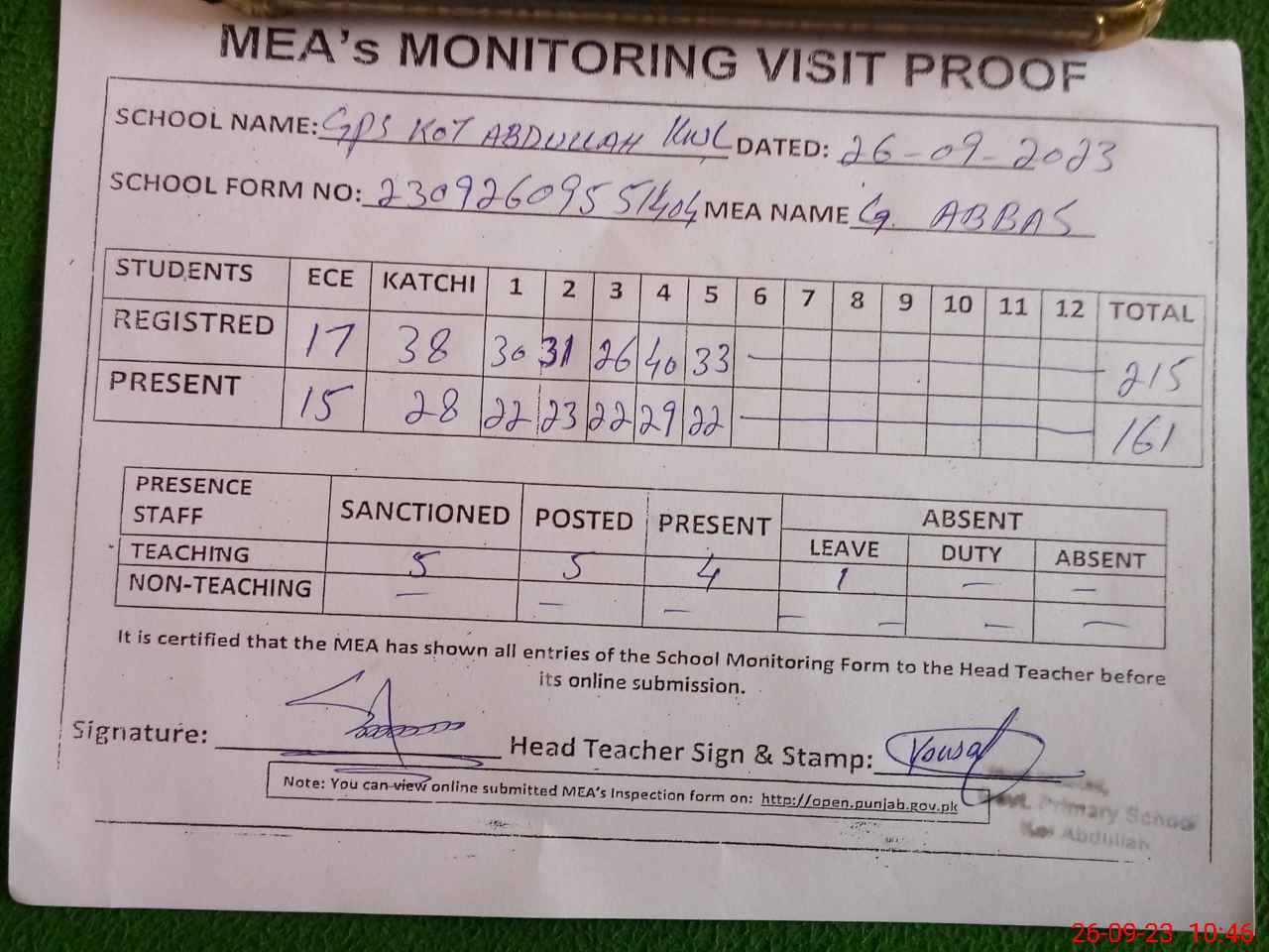 | EMIS Code: 36420217 | Name of School: GPS KOT ABDULLAH, P/O MAKHDOOM PUR, KHANEWAL | |||