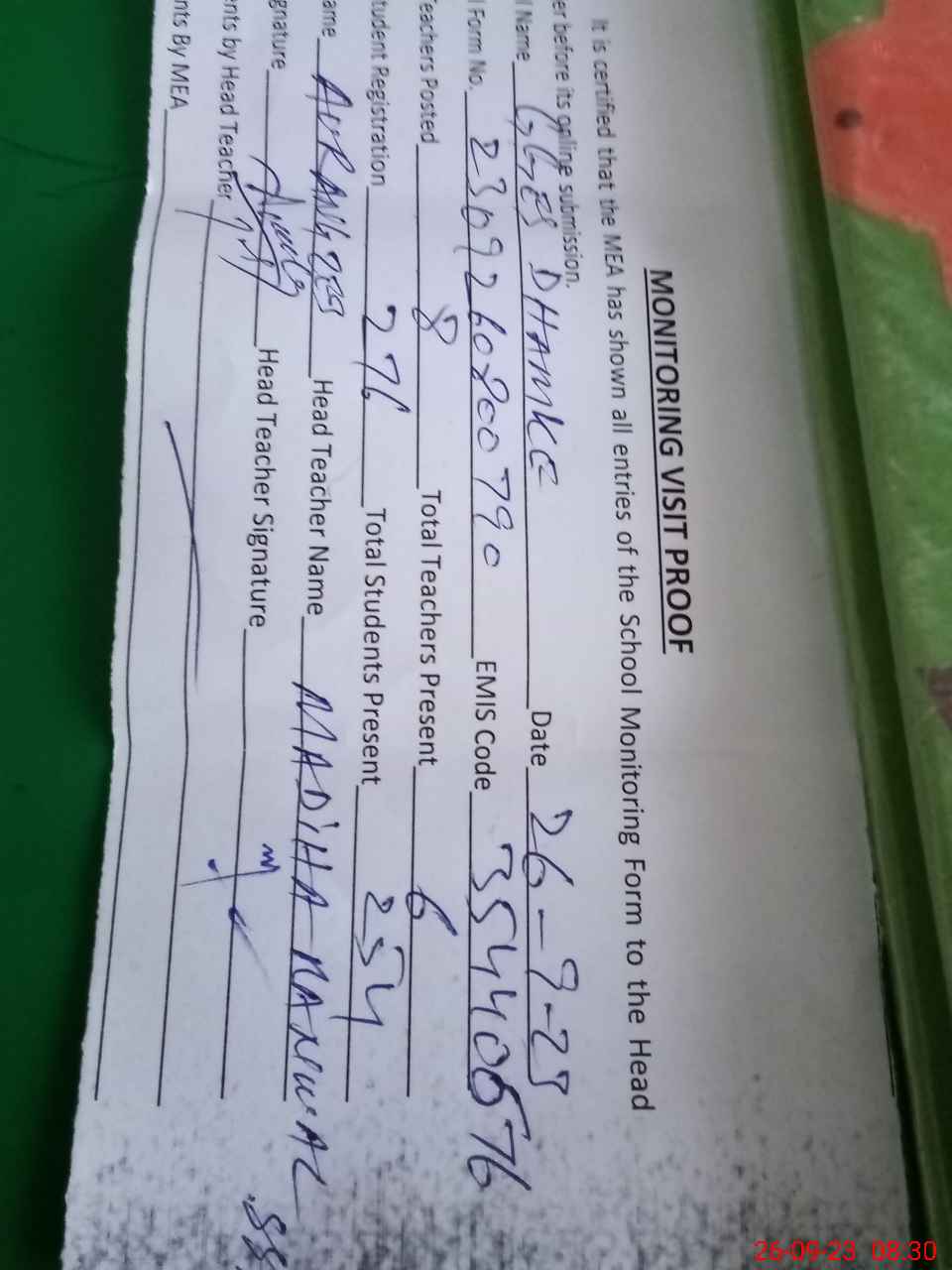 | Attendance Register | Head Teacher | MEA with School | Visit Proof |