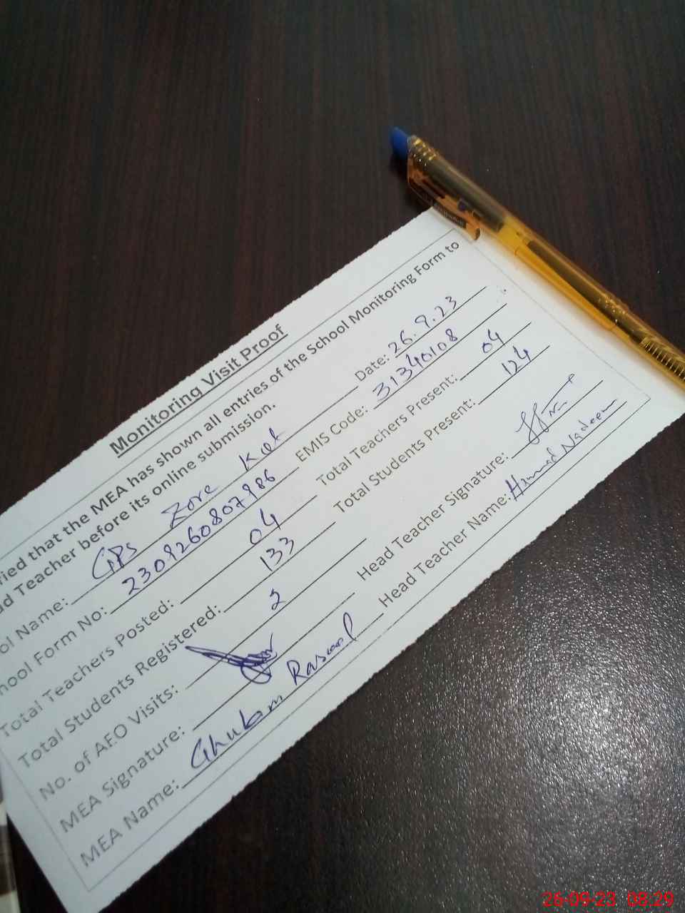 | Attendance Register | Head Teacher | MEA with School | Visit Proof |