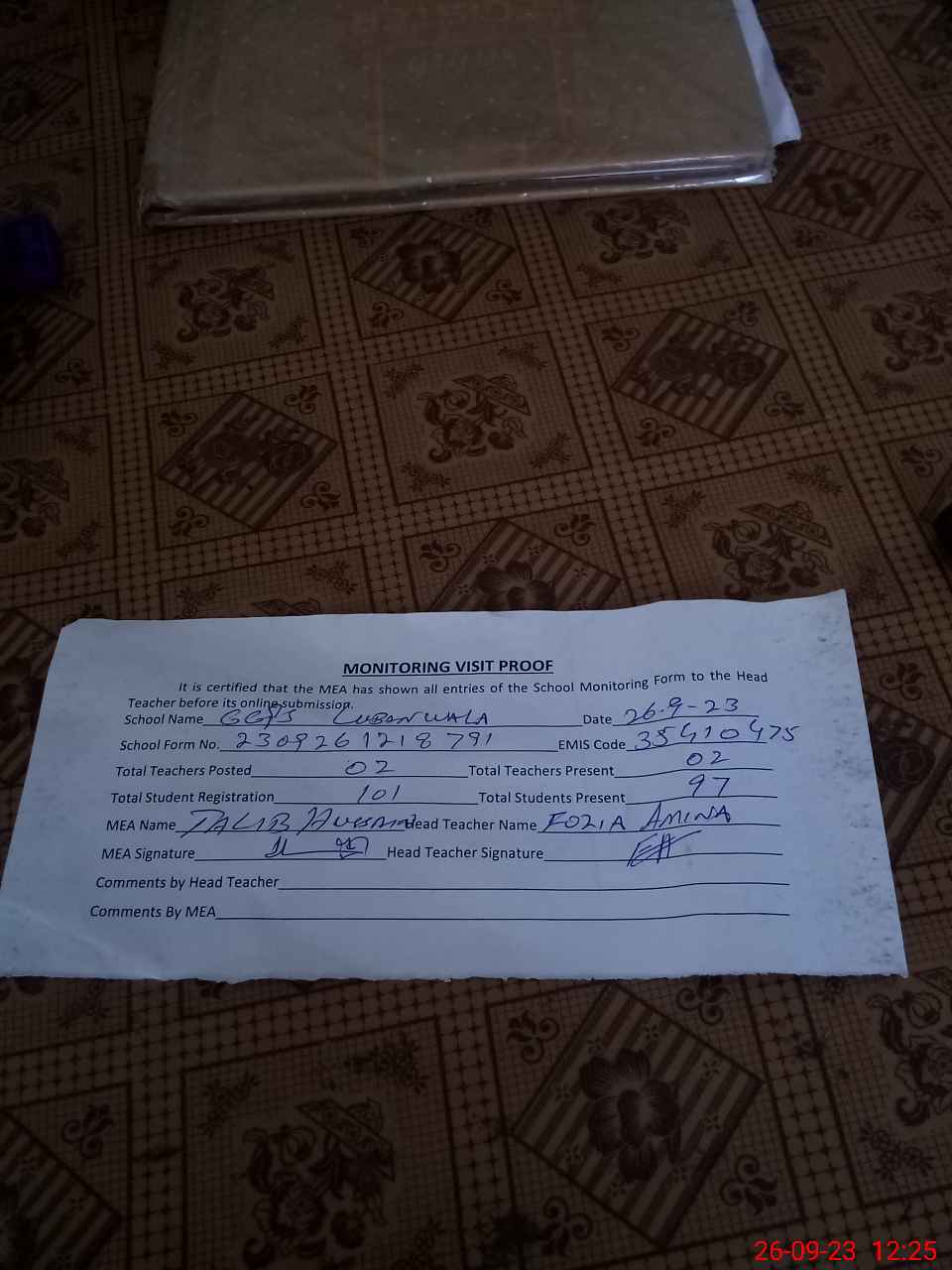 | Attendance Register | Head Teacher | MEA with School | Visit Proof |