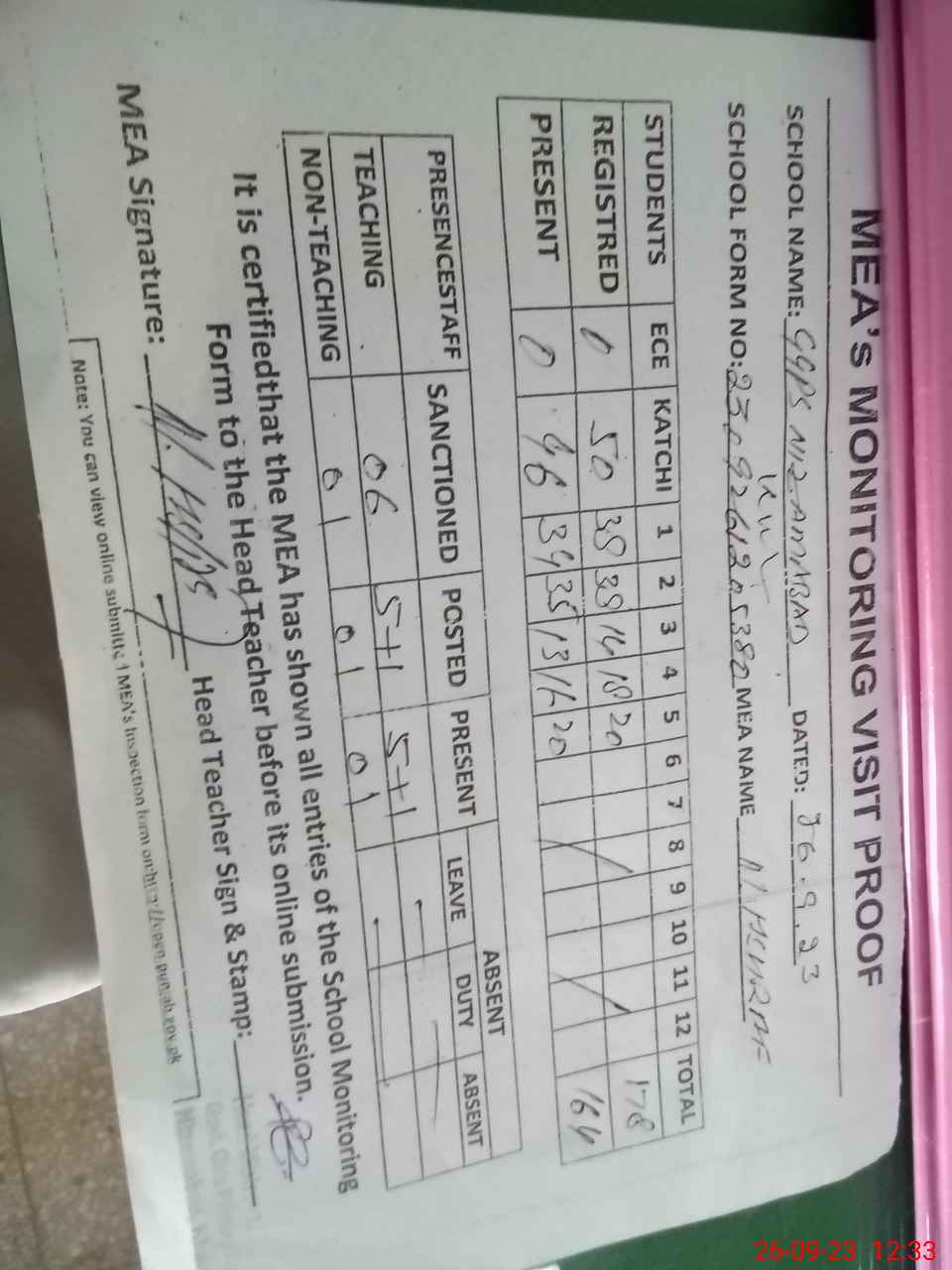 | Attendance Register | Head Teacher | MEA with School | Visit Proof |