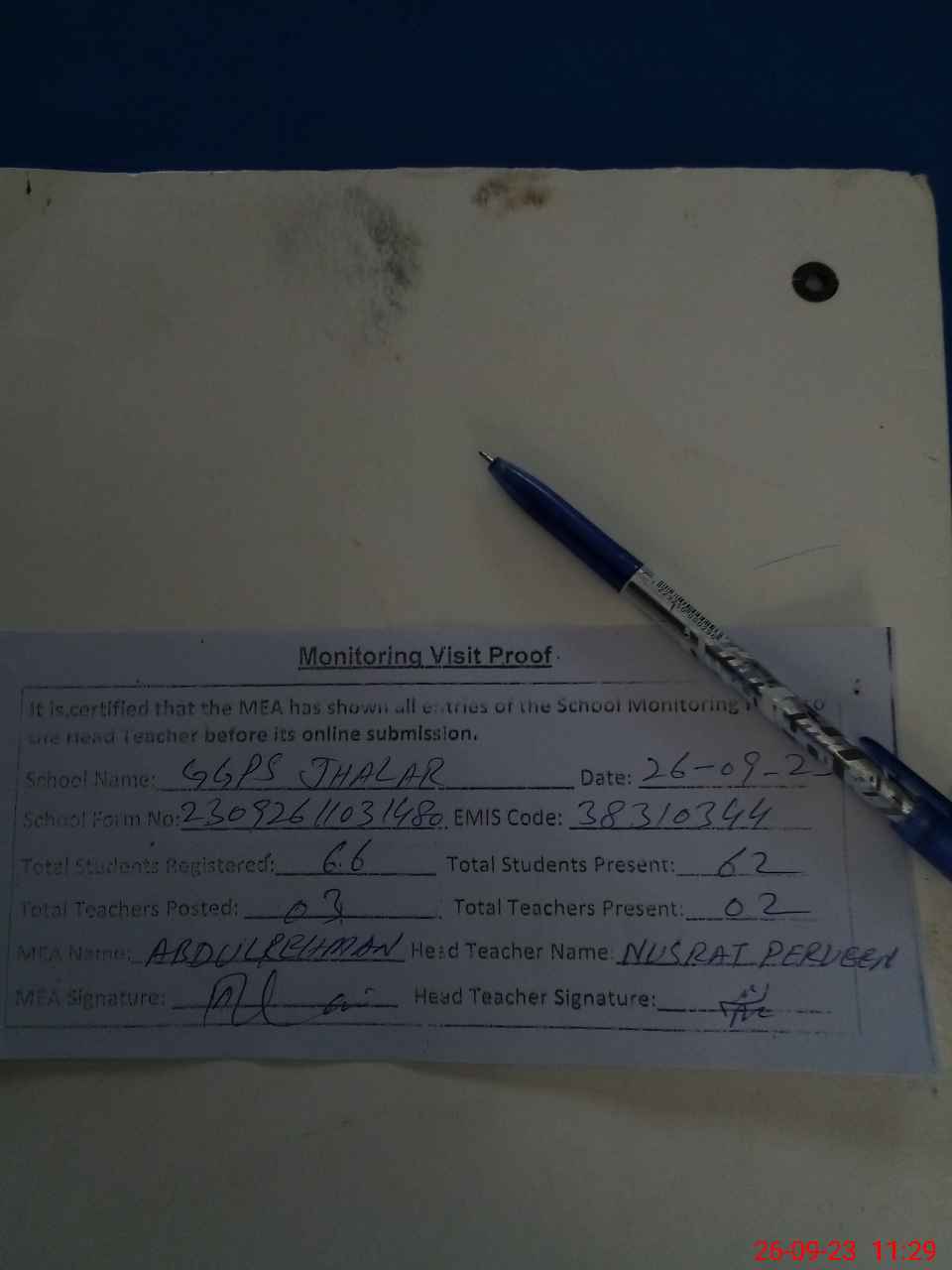 | Attendance Register | Head Teacher | MEA with School | Visit Proof |